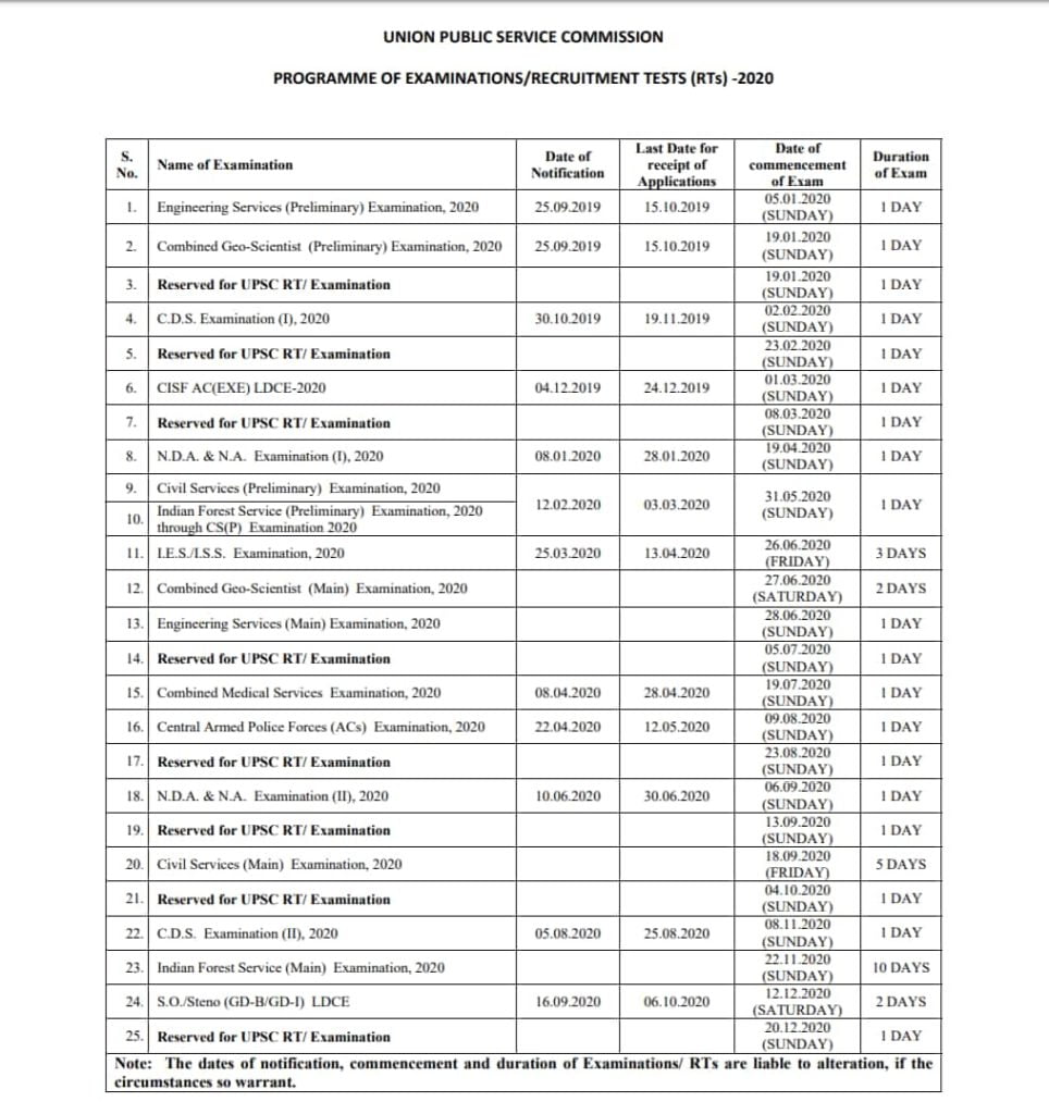 UPSC Exams Calendar for Year 2020